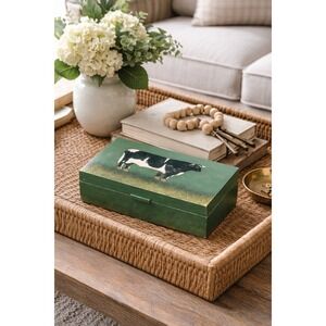 Charming vintage green wooden box featuring a hand-painted black and white cow in classic folk art style. The simple farm-inspired design and rich green color make this a perfect accent for farmhouse, cottage, or country decor.