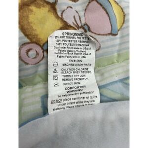 The Vintage Springmaid Alphabet Blue Jeans Teddy Baby Comforter is a charming 32x42 inch crib blanket made in the USA. This cozy blanket features a blue teddy bear theme, perfect for both boys and girls. Made of polyester, it is easy to care for and ideal for keeping your little one comfortable in their crib. The unisex design and vintage style make it a timeless addition to any nursery.