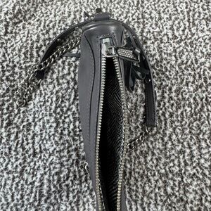 Stylish dark gray leather crossbody. Features chain strap and signature clasp. Perfect for versatile wear.