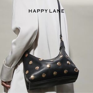 HAPPY LANE Black Polka Dot Studded Crossbody Bag | Detachable Shoulder Strap with Metal Ring Decoration, Zipper Closure, Fabric Lining. Stylish and chic, the women's bag features a sleek black design adorned with elegant gold studded accents. Perfect for any occasion, this bag combines fashion with functionality. -NIP
