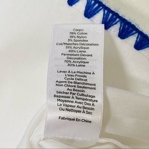 Cotton/nylon/spandex - crisp white cotton with nice polish and stretch. Adorable embroidered rounded neckline, hem of 3/4 length bell sleeve, and hem - royal blue, aqua, pink triangle design. Exposed silver tone zipper back closure with charming grosgrain ribbon tassel.