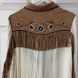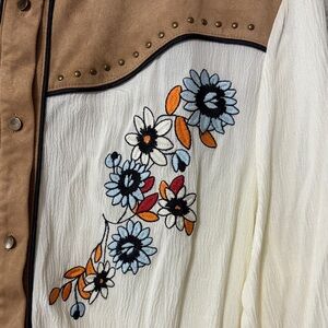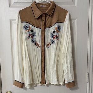Stylish women's button down shirt featuring intricate embroidery. The cream and brown colors add a touch of elegance. Perfect for casual or semi-formal occasions.