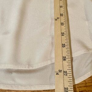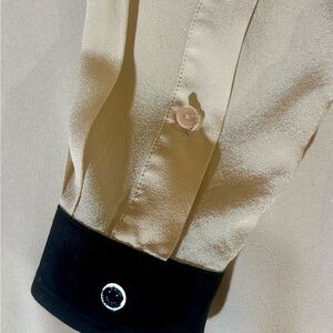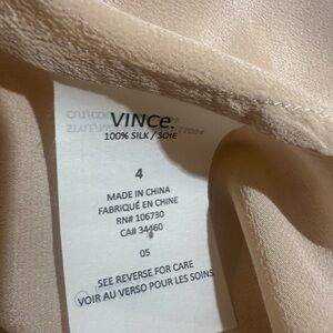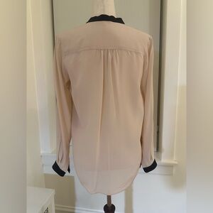 Versatile, unique, Vince blouse in blush with black trim. Features buttoned front and chest pockets and a roomier fit- see approximate measurements.