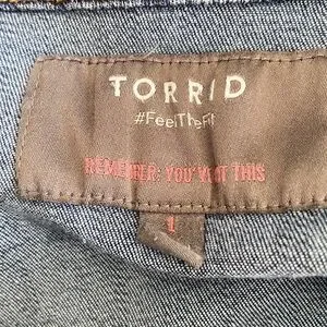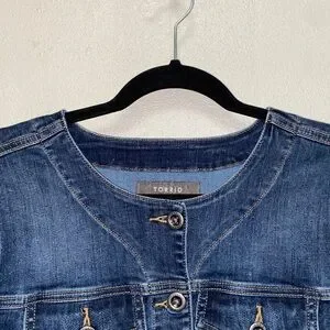 Torrid, denim jacket, bolero, cropped, blue, medium wash, collarless, three quarter sleeve, layering, casual, plus size, classic, everyday, versatile