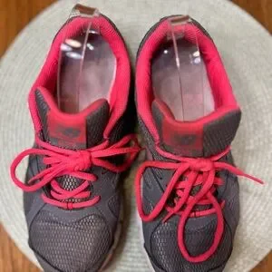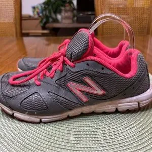 Stylish New Balance athletic shoes. Gray mesh upper with pink accents. Comfortable and durable design.