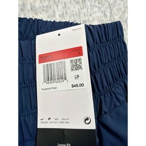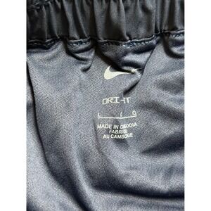 Nike Dri-FIT training shorts in a deep navy blue hue offer a loose, comfortable fit for any workout. Constructed with moisture-wicking fabric, these shorts feature a high-rise smocked elastic waistband that provides a secure and flattering silhouette. The lightweight material and curved hem allow for a natural range of motion, while the subtle gold-tone swoosh logo adds a touch of classic athletic style.