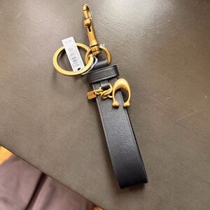 Elegant black leather keychain with gold rings and charm. Ideal for a sophisticated touch.