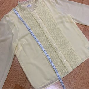 This blouse by Aritzia’s Wilfred label is a button up tuxedo style blouse with smocking and ruffle details