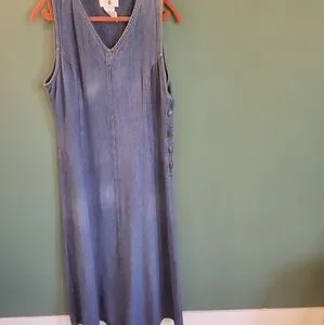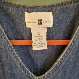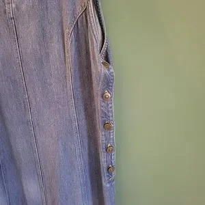 Really cute long denim dress by cotton ginny. Overalls type style, button sides. Excellent condition. Size medium, measures 20" from pit to pit cottagecore hippy style