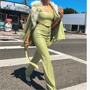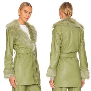 NEW NWT Show Me Your Mumu Penny Lane Faux Leather Wrap Jacket Sage Green is the perfect piece for the season! This vegan leather jacket features faux fur accents at sleeve cuffs and collar. Belt closure. Face 100% polyurethane. Back 100% polyester. Lining 100% polyester. Faux fur 100% polyester