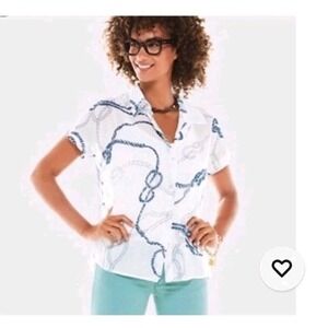 The Cabi Nautical Sheer Shirt is a stylish women's top in size medium, perfect for casual occasions. This button-up shirt features a striped pattern in white, with a collared neckline and short sleeves. Made from polyester, the blouse has a regular fit and is accentuated with buttons. The nautical theme adds a fun touch to the spring season wardrobe, making it a versatile and fashionable choice for beach sailing or everyday wear.