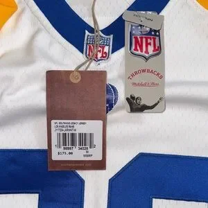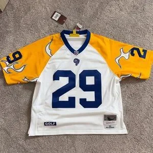 Classic Mitchell & Ness jersey. Features bold blue number 29. Yellow sleeves with white body. Ideal for fans and collectors.