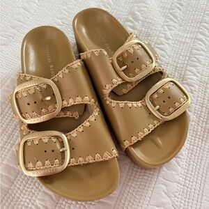 Loeffler Randall Theo Two-Band Platform Embroidered Sandal in Bisque (Tan) Leather.
