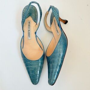 Manolo Blahnik Teal Blue Croc Embossed Leather Carolyne Slingback Heels EU 38.5