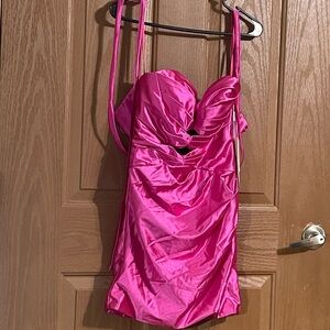Turn heads with this vibrant pink strapless prom dress. Perfect for making a statement at any special occasion. Lace up in the back.