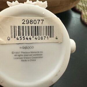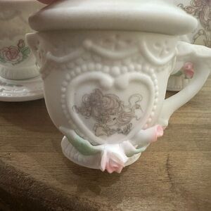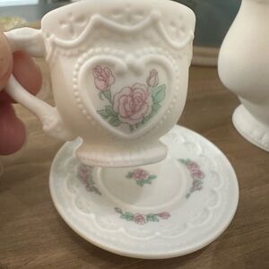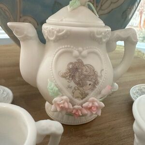Elegant miniature tea set with delicate floral accents. Please see measurements for size. It is small. Includes teapot, cups, and saucers. Great collectible. Precious Moments by enesco. 1997.