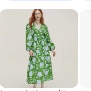 Kate Spade/Target Classic Rose green floral balloon long sleeve V-neck maxi dress. Double elastic tie waist. Pockets. Linen/rayon blend. Tiered. Green and very pale blue color. Women’s XS