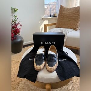 Chanel Black Leather Espadrilles with Raffia Soles- Sz. 36