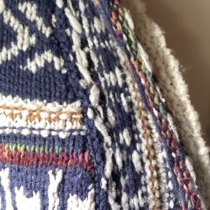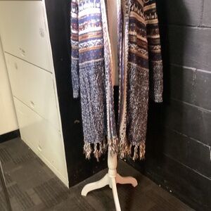 Questions? Leave a comment below! very gently used cold water Creek. We’ve taken lovely care of this coat. It is a size 3X can notice the fringe on it. Multicolor beautiful beautiful design step into spring step into fall. You can wear this coat multiple places. I love to see these and ladies at the flea markets with boots and jeans no smoke no pets
