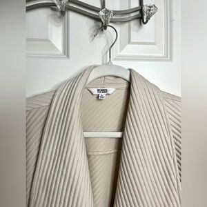 Chic cream jacket with ribbed knit texture. Open front design. Cozy and stylish. Effortlessly transition your wardrobe from season to season with this gracefully draped knit jacket.
