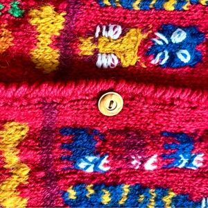 Excellent pre-owned condition. No detectable holes, stains, or snags. Please note: given its hand-knit, multi-color construction, you will find tied yarn ends inside (see photo). This is a feature of the sweater's original design, NOT a flaw or imperfection and does not interfere with the quality of the garment. All wood buttons are in excellent condition with no cracks or chips and still secured with their original leather ties.