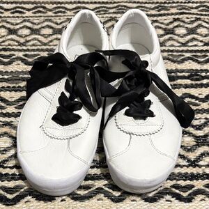 Stylish white sneakers featuring black ribbon laces. Perfect for casual wear.(I no longer have the original laces)(worn once)