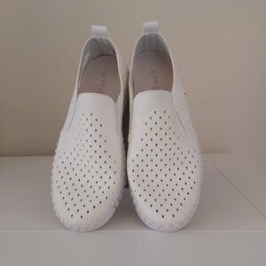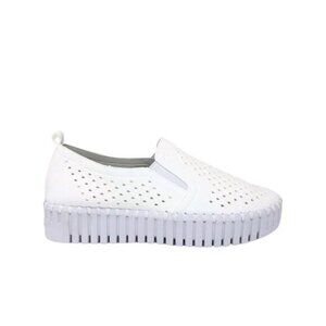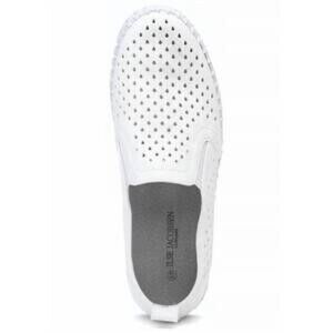 Get your daily steps in with these adorable sneakers. Introducing the women's Tulip slip-on sneakers by Ilse Jacobsen, designed to blend comfort with style. These sneakers feature a white perforated man-made upper with a suede lining, making them an ideal choice for streetwear and travel occasions. They boast a flat heel style with an approximate 1" platform and flexible rubber sole, ensuring all-day comfort. Additional details include dual gore elastics and a rear pull tab for easy on and off.