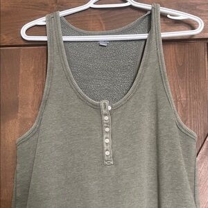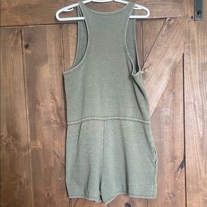 Stylish olive green sleeveless romper with button details and drawstring waist. Perfect for casual outings. one small white spot on it. its very small check out the pictures size large. pit to pit 20 inches