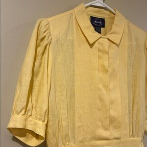 Charming yellow dress with pleated design. Features a classic collar and short puff sleeves. This measure is about 49 inches long, with a 28 inch waist and about 18 1/2 inches across the chest. It does have a lightly padded shoulder.