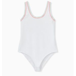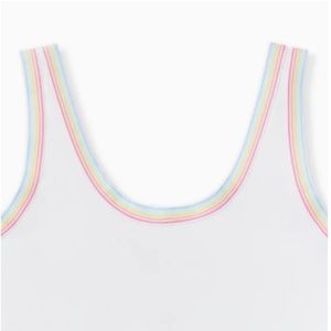 Bright white with pastel rainbow trim bodysuit. Snap crotch.