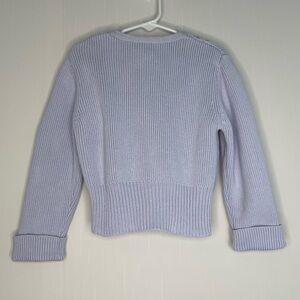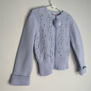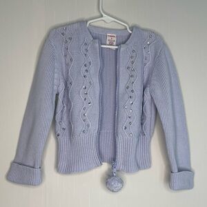 Good preowned condition. 2004 Gymboree full zip lavender light purple (imo) cardigan sweater. Sequins sparkle with a pom-pom zip pull. 100% cotton, machine wash. No stains or holes some minor wear. Measurements in pictures size 4