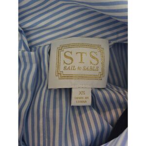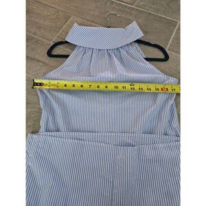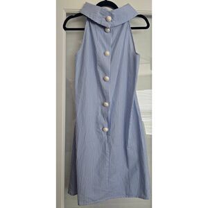 Women's Sail to Sable Sleeveless Collared Dress. Neck is like a high cowl neck. Big white buttons line the back. Blue and white stripes. Very lightweight. 100% cotton. Size XS, could probably fit a small, but please review measurements. There is no stretch. Great condition.