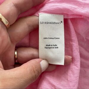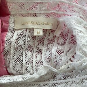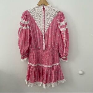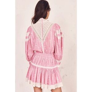 The Victorian-inspired Viola Dress arrives in custom, hand-dyed dobby cotton with contrast floral lace and a calico flowered print. This relaxed frock has a high collar and an inset triangular lace yoke above an elastic waist. A hidden placket with center buttons lines the back. Shirred elbow-length puffed sleeves are finished with a pintucked cuff, mirrored by pin tucking at the top panel of the miniskirt.