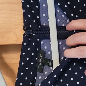 Talbots Blue White Polka Dot Dress. Size 12. Hidden back zipper, stretchy fabric, tailored with waist band and pleating at hem. Approximate Measurements: Pit to Pit 19.5, Waistband 17.5, Length 39. Appreciate you shopping my closet!