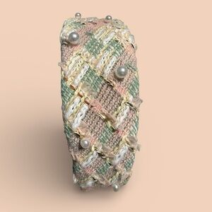Lean into your preppy side with pastel tweed, adorned with delicate pearl embellishments. The textured tweed fabric adds a touch of sophistication to any outfit, while the soft pastel hues infuse a subtle charm. Embrace a timeless and playful look with this headband, perfect for adding a touch of elegance to your everyday attire.