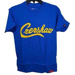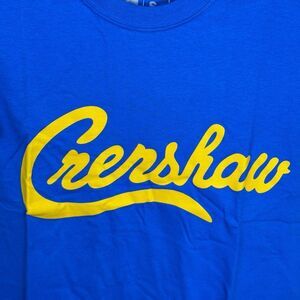 Vibrant blue tee featuring bold yellow Crenshaw script. Ideal for everyday style.