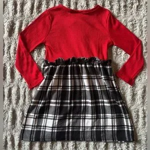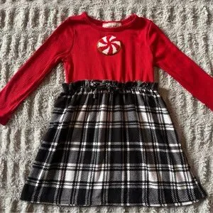 Red ribbed long sleeve top with peppermint patch detail and black/white plaid skirt. Soft, stretchy fabric with elastic waist. Perfect for Christmas parties, photos, and school programs.