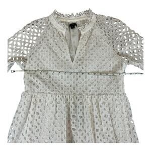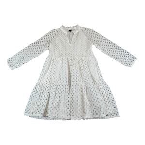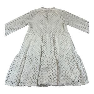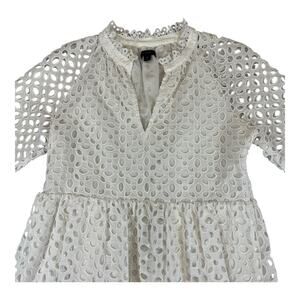 J.Crew dress in white eyelet lace cotton blend, designed with a romantic bohemian silhouette perfect for spring and summer. Featuring a tiered skirt, semi-sheer sleeves, and delicate ruffled neckline, this dress moves beautifully with every step. Fully lined through the body for coverage while keeping the airy texture of the embroidered eyelet lace. Ideal for brunch dates, weekend strolls, or dressed up for casual weddings and garden parties.