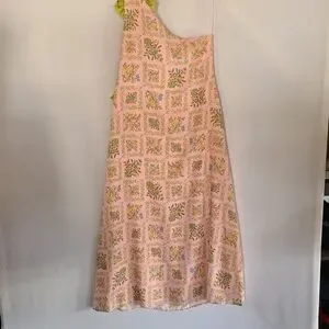 Beautiful one-shoulder maxi dress in a soft pink floral patchwork print. Features a statement green shoulder tie/bow that adds a fun, feminine touch. Flowy silhouette that’s perfect for spring events, weddings, vacations, or brunch.