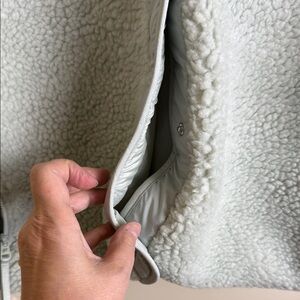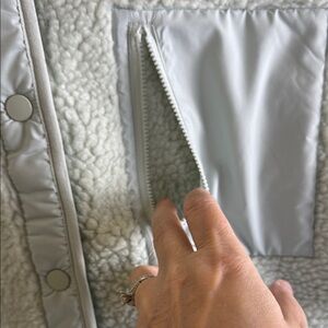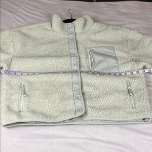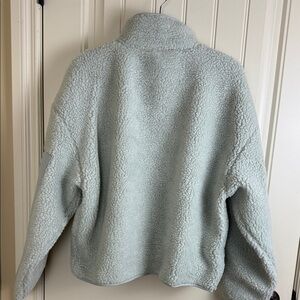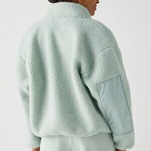 The coziest jacket you'll ever wear — and the perfect way to complete every look. This Fabletics jacket features a soft teddy fabric, side zip pockets, and a snap closure for ease. Plus, the boxy, oversized fit makes layering a breeze. Fabletics calls this colour "Tumbled Stone"; it looks like a mint green :)