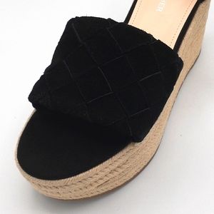 Stylish black espadrille wedges. Features woven platform and sueded upper. Adjustable ankle strap. Platform heel height of 3.4375 at the highest point and 2 inches at the lowest point. Box not included.