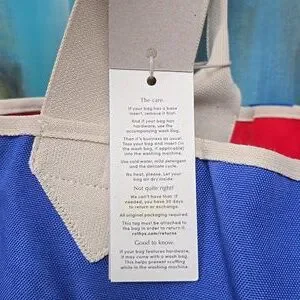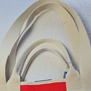 Bold red or blue reversible tote with sturdy cream handles. Ideal for daily essentials or beach trips!