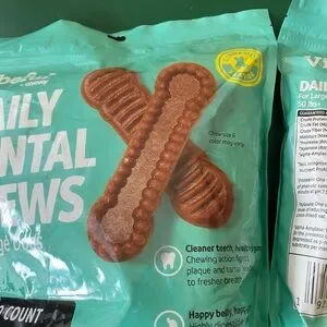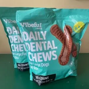 Vibe Daily Dental Chews promote healthy teeth for large dogs. Comes in a teal package with brown chews. Ideal for oral care.