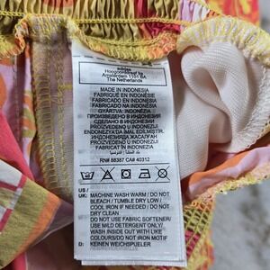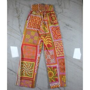 This is a collaboration piece that blends sporty functionality with vibrant Brazilian-inspired design. These wide-leg track pants feature a bold, allover geometric patchwork print inspired by a kaleidoscope and the rhythmic waves of Brazil's Copacabana beach. The color is listed as Semi-Pink Glow/Chalk White. They include a comfortable, stretchy high-rise waistband and side-slit hems for added movement. This product is made with 100% recycled materials. They come new with tags. There is a tiny defect in one of the suns shown in picture.