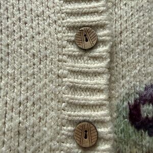 Beautiful cardigan with multicolor patterns. Features decorative buttons and a collar.
