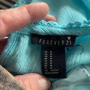 This dress was upcycled and dyed turquoise from a white Forever 21 rayon top and a paisley Tommy Hilfiger chiffon dress. Parts of the dress were also used on the sleeve ruffles. The skirt was completed with a cotton ruffle, decorated with thrifted double sided floral wedding lace. Skirt has a polyester knit modesty lining, as do the sleeve ruffles, which could be easily removed. I added underwear lace at the joining of the top and skirt to cinch it in a bit. Very comfortable and flowy! In the video, I am wearing it with a petticoat. Neck to hem measures 47".