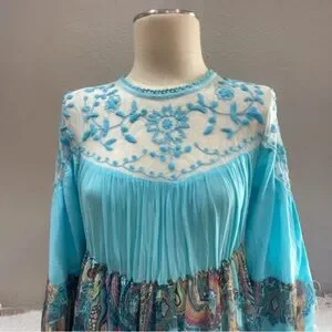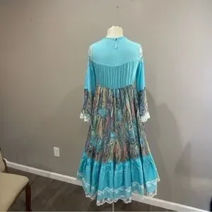 Upcycled Turquoise Boho Maxi Dress with Lacy Top & Paisley Ruffled Skirt, Size M
