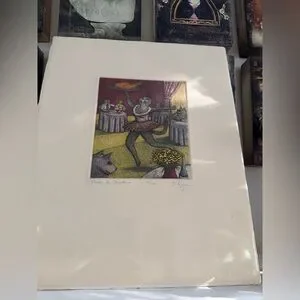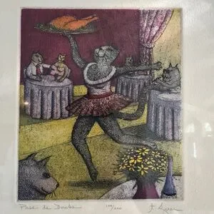 Add whimsy and charm to your collection with this delightful limited edition print titled "Pass de Duck" by T.P. Speer. This playful piece features an anthropomorphic cat in a ballet pose serving a roast duck in an elegant restaurant full of dapper feline patrons. The humorous scene is brought to life with vibrant hand-coloring and fine detail.