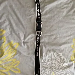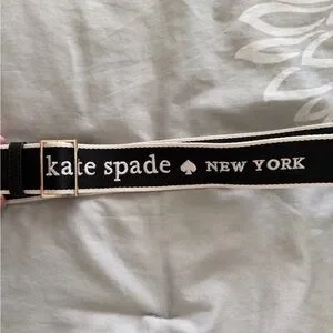 Chic cloth purse strap by Kate Spade featuring bold logo design. Elegant black and white color scheme.