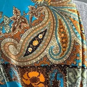 Add a touch of elegance to your outfit with this beautiful paisley silk scarf. Featuring vibrant blue and orange hues, it's perfect for any occasion.